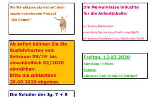 COVID-19-Regeln ab 11.05.2020 Allgemeine Mundschutzpflicht Auf dem gesamten Außenschulgelände muss Mundschutz getragen werden. Ausnahme: Im Gebäude, solange die SchülerInnen an ihrem Platz sitzen oder auf die Toilette gehen. Verhalten im Klassenzimmer Die SchülerInnen sitzen grundsätzlich auf ihren Plätzen, stehen nur in Absprache mit der Lehrkraft auf. Jeder darf nur sein eigenes Material benutzen. SchülerInnen dürfen kein Material untereinander tauschen. Toilettengang Die SchülerInnen müssen sich abmelden, bevor sie zur Toilette gehen. Auch in der Pause müssen sie sich dafür abmelden, damit sich nicht versehentlich zwei gleichzeitig dort treffen. Es darf immer nur 1 Person in den gesamten Toilettenraum. Ggf. [...]